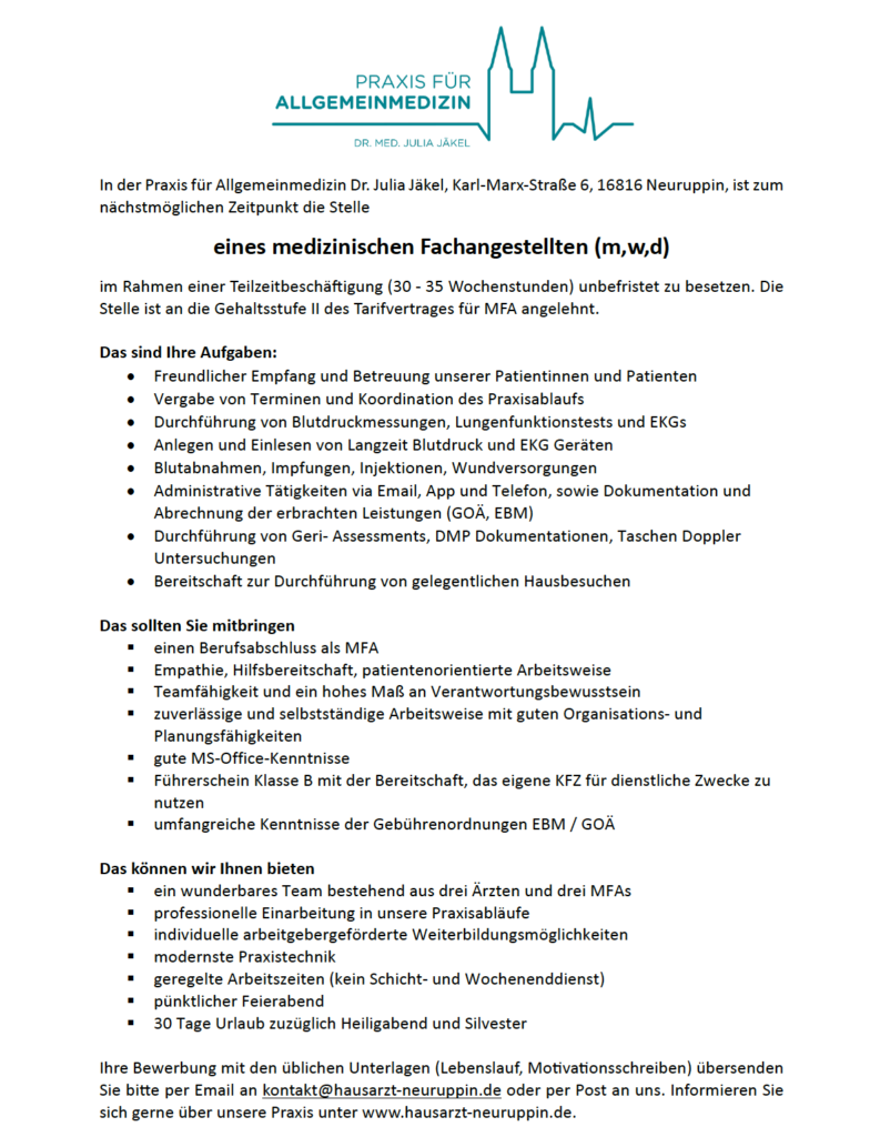 Wir erweitern unser Team! Ab dem 01.12.2024 arbeiten wir mit drei Ärzten und vier Schwestern in unserer Praxis. Die geänderten Öffnungszeiten können Sie hier auf unserer Homepage einsehen. Wir freuen uns Lisa Schneider als Ärztin in Weiterbildung zur Fachärztin für Allgemeinmedizin bei uns begrüßen zu dürfen. Frau Schneider wird die verbleibenden zwei Jahre ihrer fünfjährigen Weiterbildung nun bei uns in der Praxis verbringen und gemeinsam mit Frau Dr. Jäkel deren Patienten versorgen.